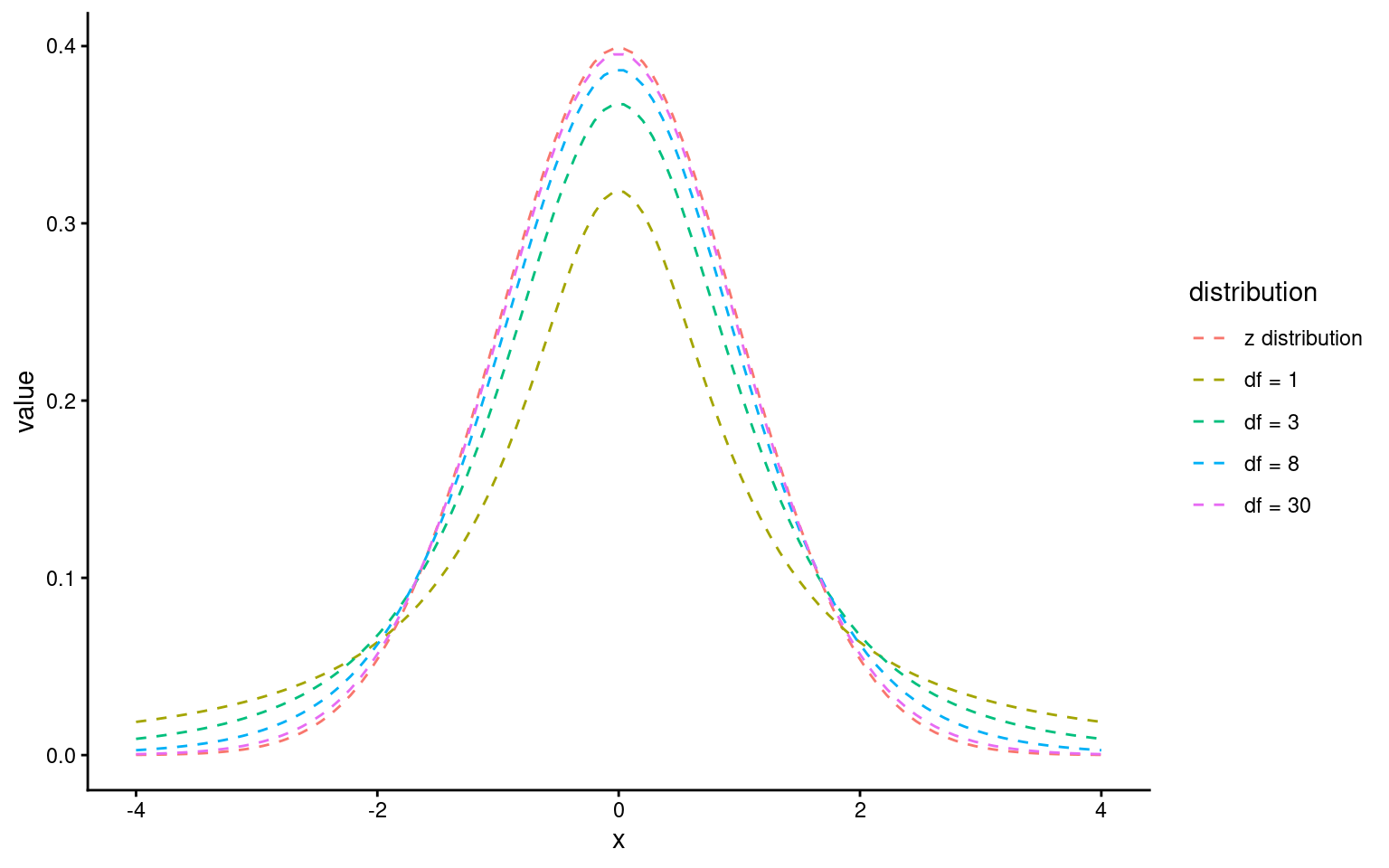 The t-statistic is closely related to the z-statistic but is used in significance testing when the sample size is small or the population standard deviation is unknown. As we almost never know the “population” standard deviation, it is always safer to use the t-distribution for significance tests.