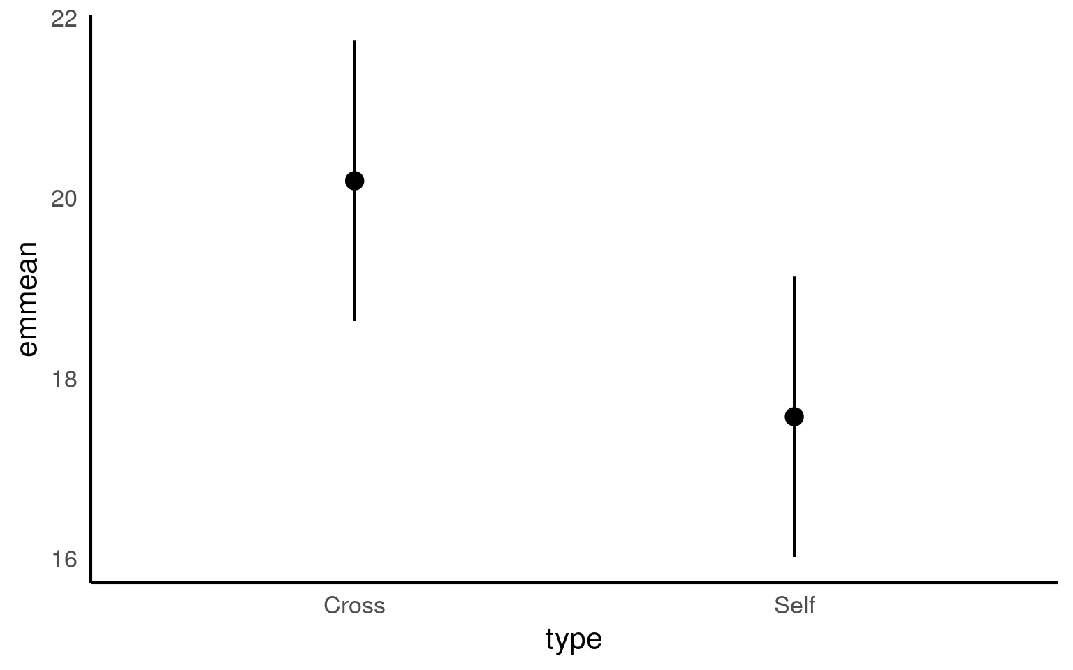 In this case we can see that the upper and lower bounds of the confidence intervals do not contain zero. The difference in height is consistent with Darwin’s alternate hypothesis of inbreeding depression.
