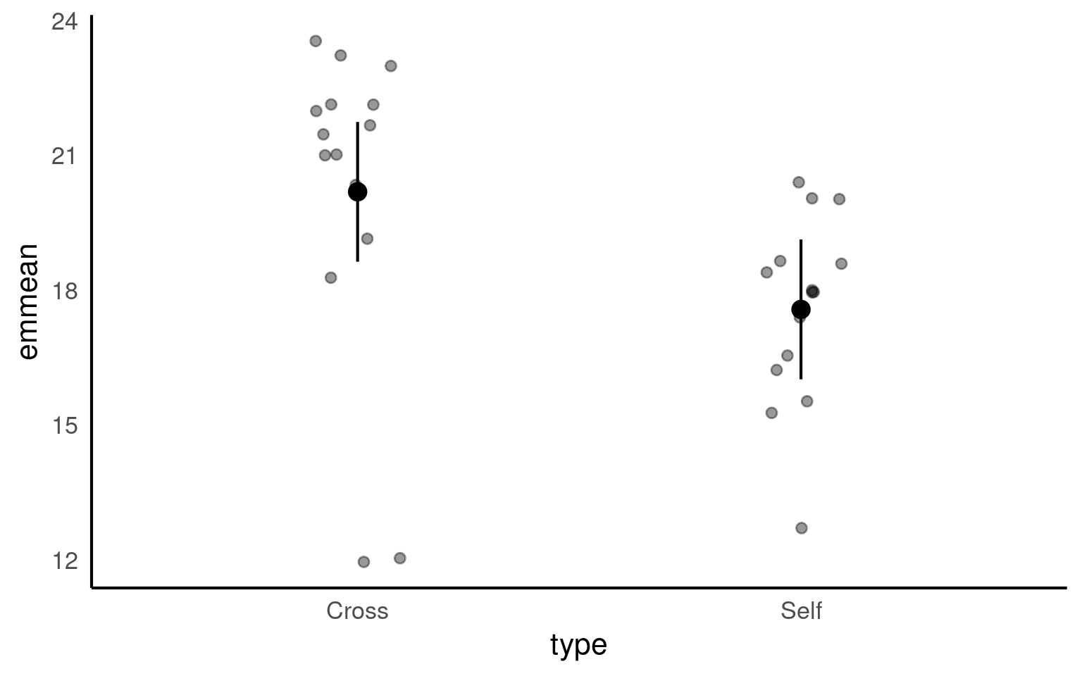 emmeans also gives us a handy summary to include in data visuals that combine raw data and statistical inferences. These are standard ggplot() outputs so can be customised as much as you want.