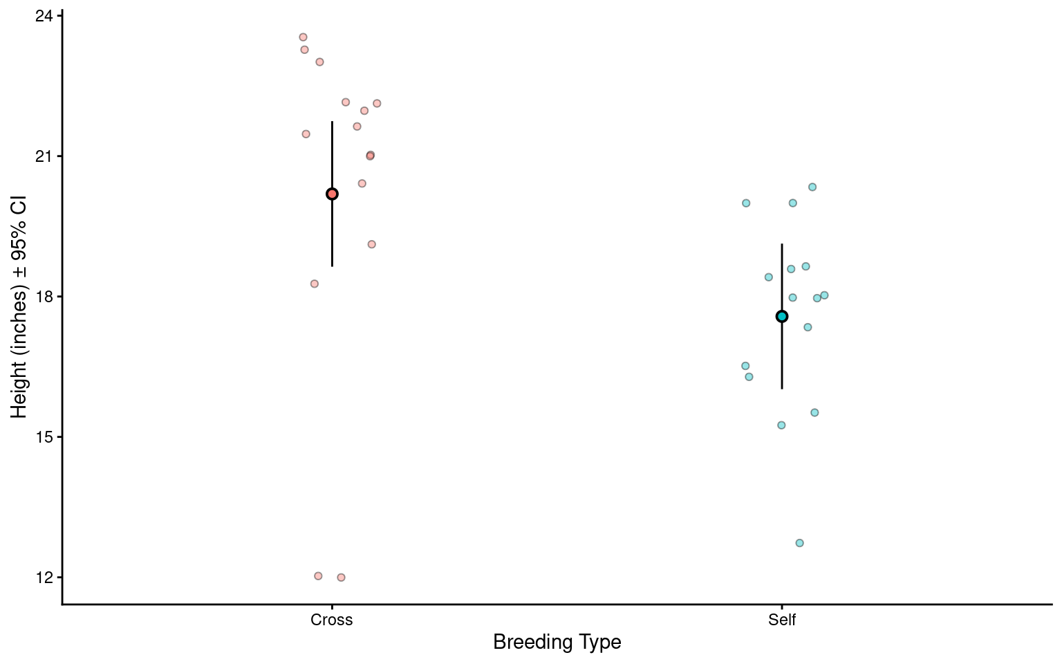 A 95% CI provides a range of values where the true effect (like a difference between two group means) is likely to fall. Our analysis suggests that within the 95% confidence interval the true (population) difference could be between 0.42 and 4.8 inches in height difference between crossed and selfed plants.