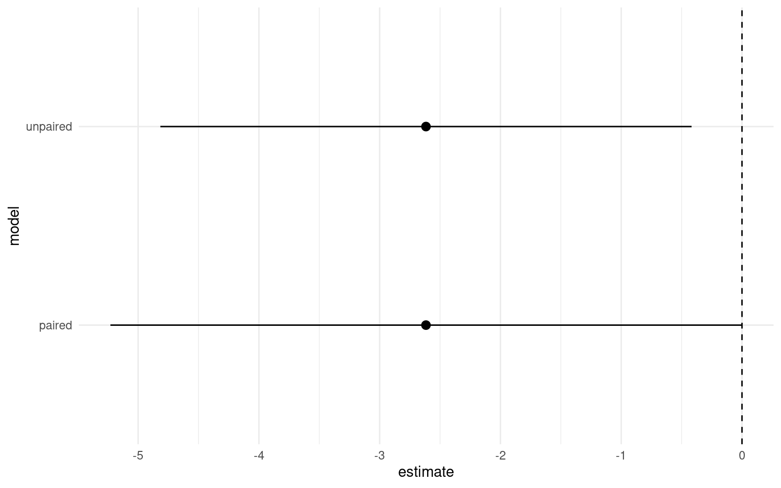 We can see that estimate of the mean difference is identical but the 95% confidence intervals are now slightly different. So in this particular version we have actually increased our level of uncertainty by including the pair parameter.