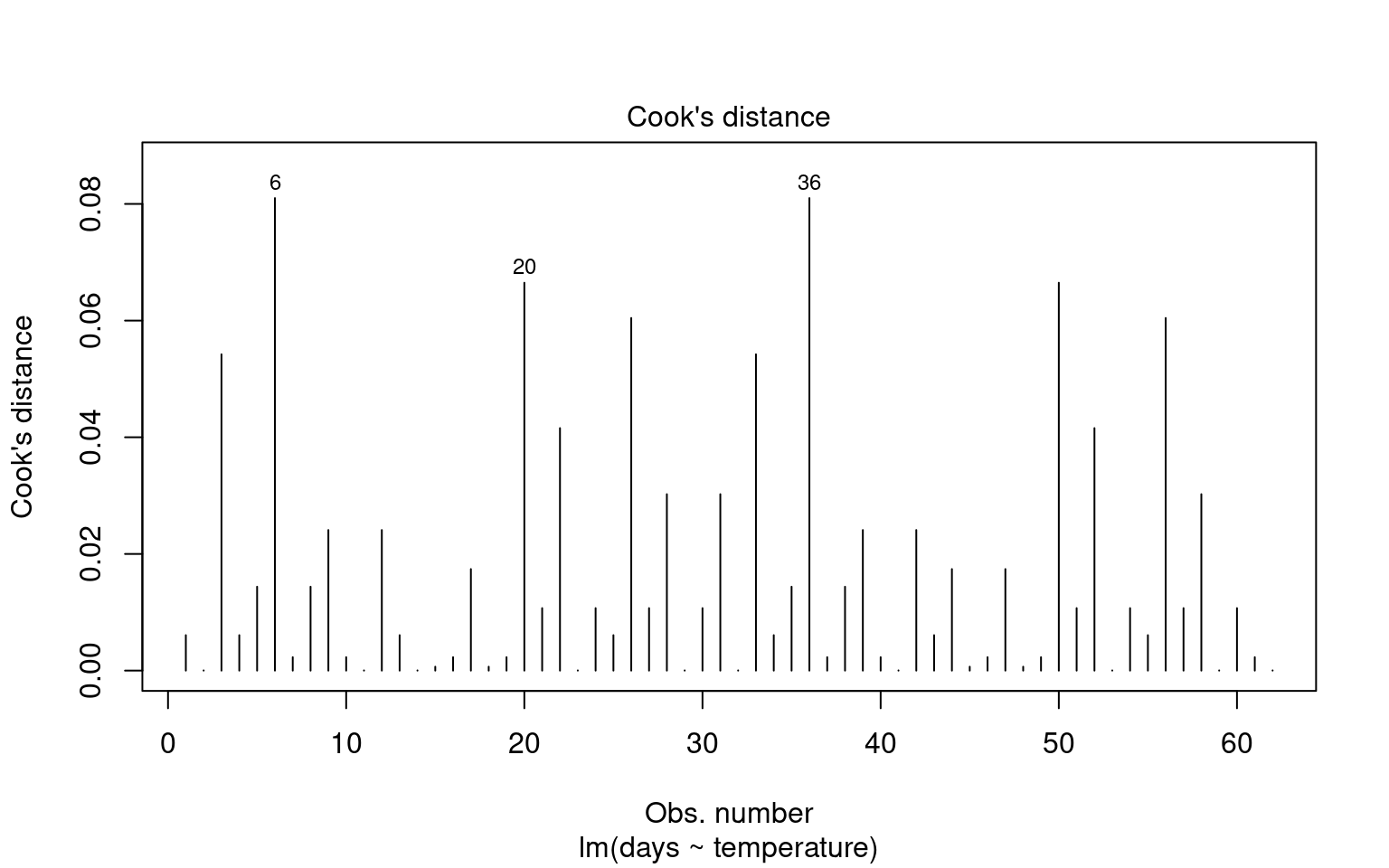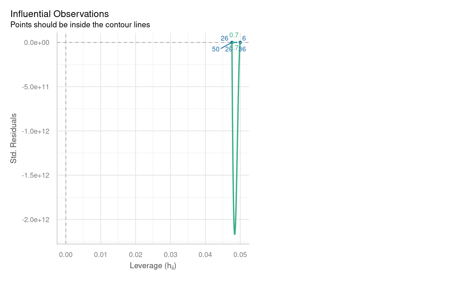 To identify outliers, we can employ Cook’s Distance, which measures the influence of each data point on the model fit. Large values of Cook’s Distance suggest that a point may be having an outsized effect.