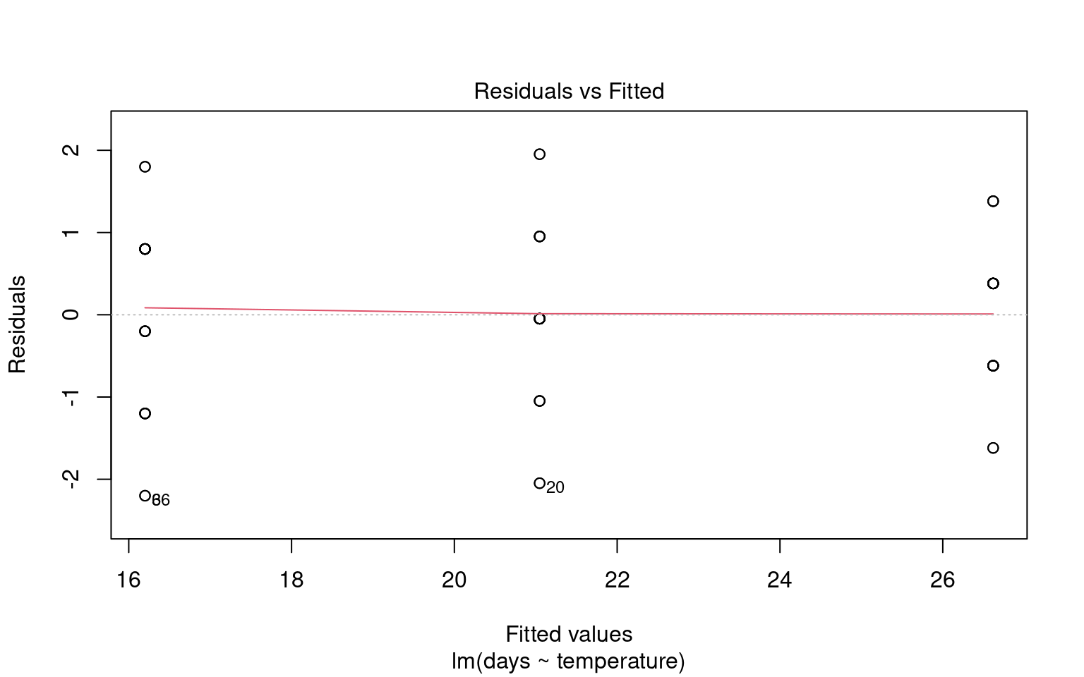 To assess this assumption, we can plot the residuals against the fitted values:
