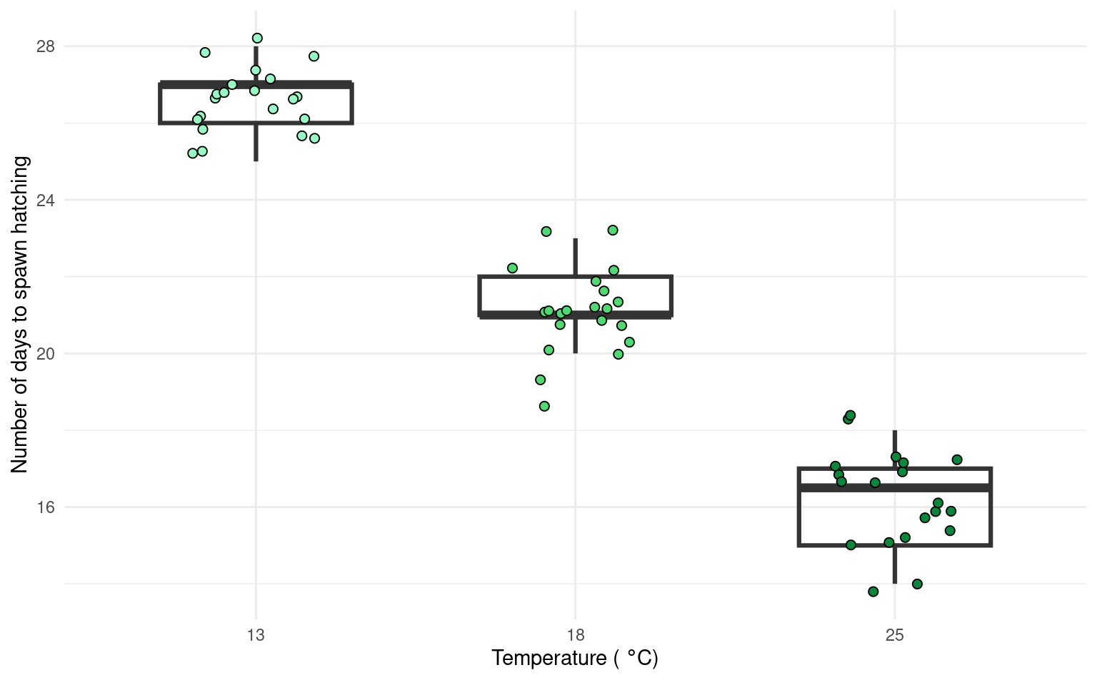 We want to compare the means of 3 independent groups (13°C, 18°C and 25°C temperature groups) and we have one continuous response variable (Hatching time in days) and one categorical explanatory variable (Temperature). One-way ANOVA is the appropriate analysis!