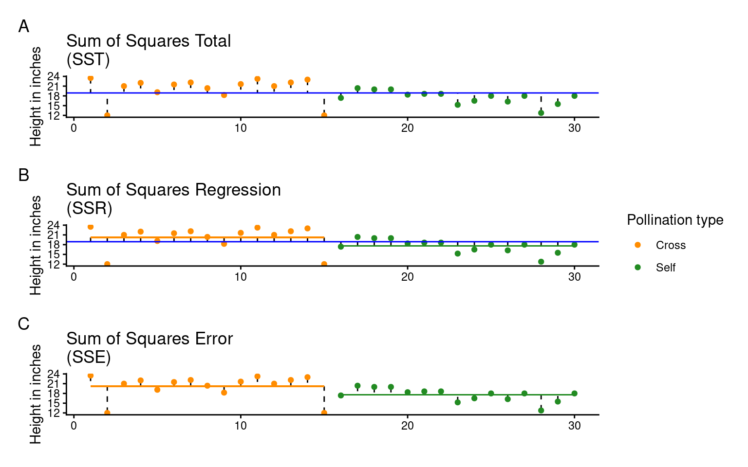 Least squares quantifies A) total least squares, B) treatment least squares, C) error sum of squares (SST, SSR, SSE). The vertical lines measure the distances, which are then squared and summed. SST is calculated by measuring to the intercept, SSR is calculated by measuring the distance of the estimates to the intercept, SSE is calculated by measuring the distance to the estimates