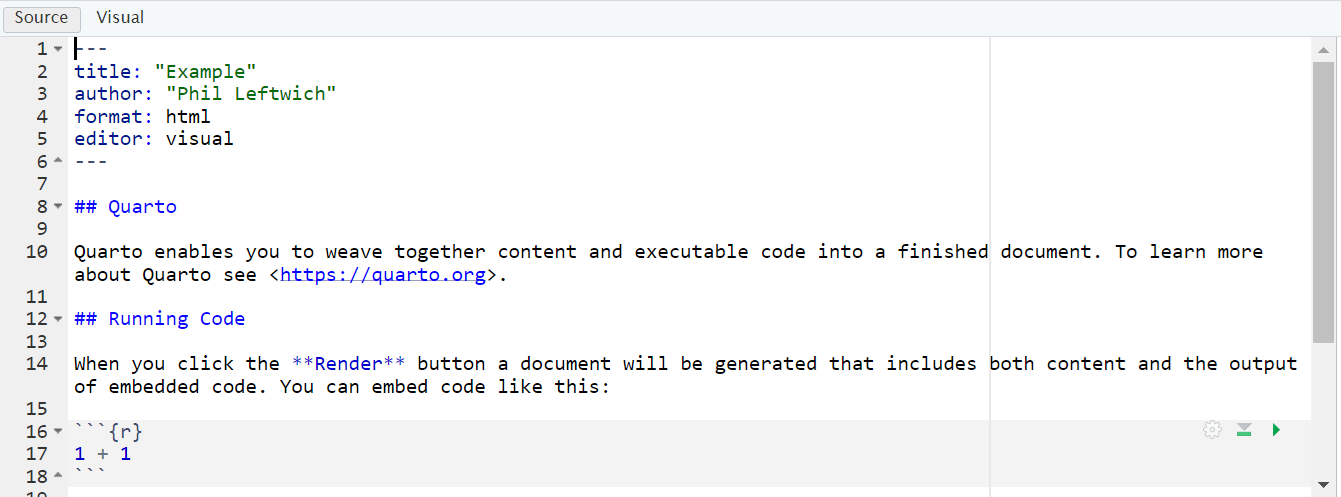 Rstudio lets you view your Quarto document in visual (partially rendered) or source (all plain text) mode. The code and explanations below work best if you are viewing in source