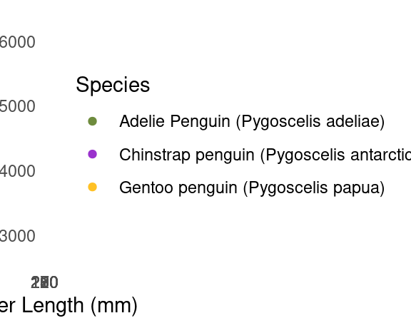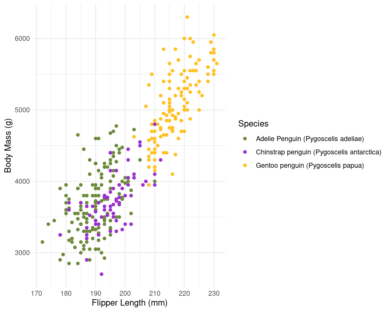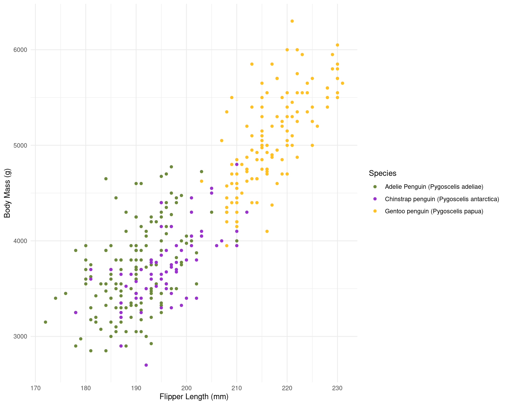 | Species | Body Mass (g) | Flipper Length (mm) |